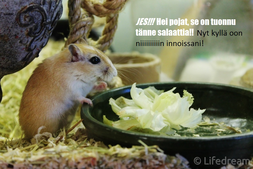 Annan niille vähän tuoretta salaattia, kurkkua, tomaattia, porkkanaa, kaalia, banaania tai hedelmiä joka päivä vähän vaihdellen ja hyvin pieniä määriä. Ne saavat myös heinää, keitetyn kananmunan kuoria, koirien kuivanappulaa ja jauhomadoillakin on jo päästy herkuttelemaan. Varsinkin Opie tykkäsi ja söi niitä yksin varmaan viisi :O Ihme kyllä se ei räjähtänyt 😀