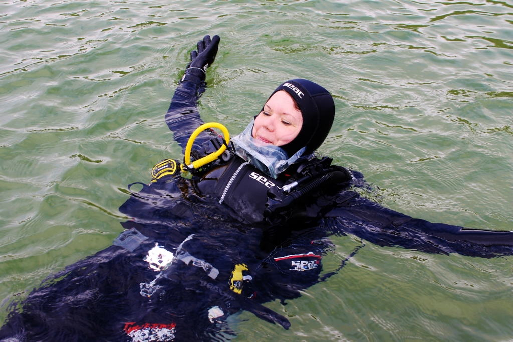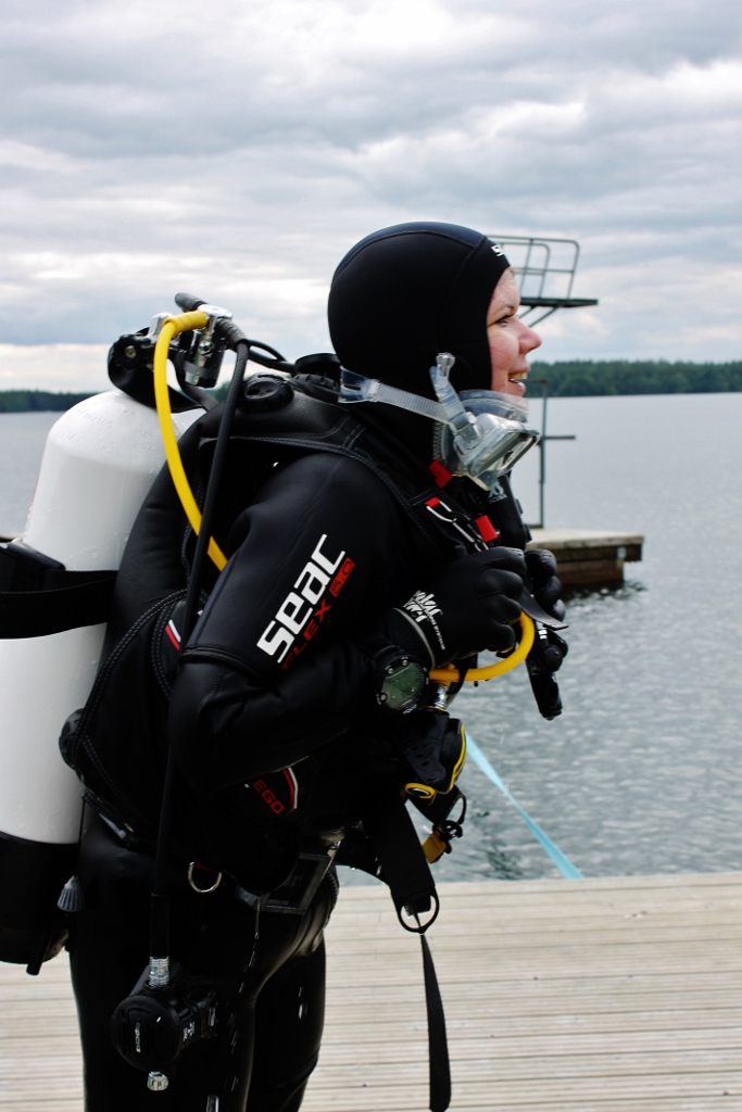 Lopulta olimme valmiit pienelle sukellukselle. Järvi oli samea eikä siellä ollut juuri nähtävää. Aluksi kaikki energiani meni kropan hallitsemiseen, tuntui että olin joko pinnassa tai pohjassa 😀 Jouduin käyttämään käsiäni saavuttaakseni tasapainon, vaikka ystäväni vieressäni vain polski tyynesti jaloillaan. Näkymä veden alla oli vihreä ja samea, siellä täällä oli leväisiä ruokoja tai pohjassa lepääviä puunrunkoja. Vesi oli myös kylmää, se tunkeutui pukuni alle ja sai varsinkin teoriaa opetellessa minut palelemaan. Kokemus oli kuitenkin loppujen lopuksi ihan huikea! Mitä se voisikaan olla kirkkaammassa vedessä, jossa olisi jotakin nähtävääkin!?