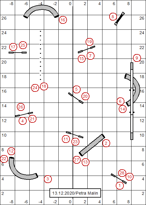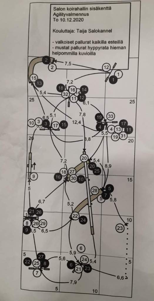 Taija Salokanteleen treenit jäävät meiltä nyt ainakin hetkeksi tauolle. Taijan treenit ovat olleet vauhdikkaita ja minulle ja Piikulle erittäin teknisiä. 30-40 esteen radoilla on useita päällekkäisyyksiä, sillä Salon koirahalli on ahdas isomman kentän treeneille. Tuntui usein, että minulta meni kaikki energia muistaa rata, saati että olisin kyennyt pohtimaan ohjauskiemuroita. Onnistumisen tunteet näillä radoilla olivat kuitenkin huikeita ja niitä tuli lähes joka kerta! Agilityratoja Piiku jaksoi juosta 20min aikamme täysillä ja oppi useita vaikeita ohjauskiemuroita. Alla viimeinen ratamme, jonka teimme kolmessa pätkässä. Taija kehui, että Piiku kyllä tekee hienosti, kunhan itse tiedän mihin ja miten olen ohjaamassa. Siispä suurin kehittymiskohde ensi vuodelle on oikeiden linjojen löytyminen.