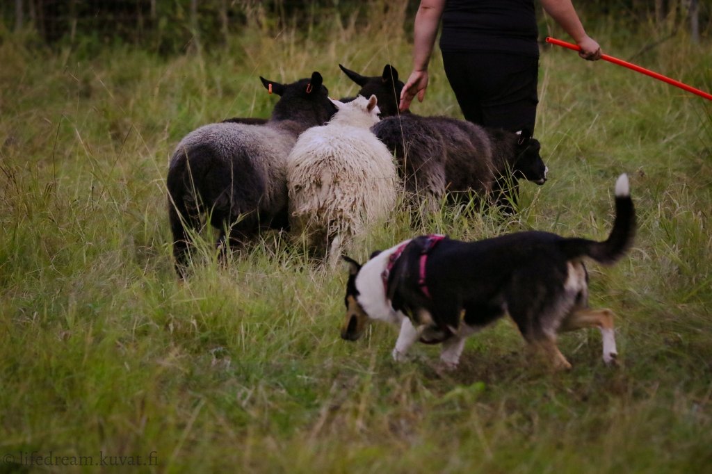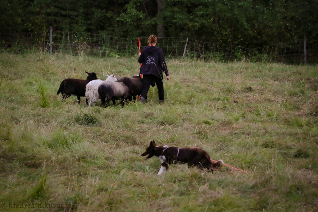 Piiku aloitti ekan kierroksen. Lähdettiin kulkemaan lampaiden perässä liinassa ja Piiku oli heti kiinnostunut eläimistä. Lampaat olivat liikkuvaisia ja juoksivat helposti alta pois vaikka Piiku lähestyi ihan nätisti liinassa. Saimme kuitenkin muutaman hyvän kaaren aikaiseksi. Toisella kierroksella Piiku oli irti ja päästiin jo kuljetuksen makuun. Kokeilimme ensin työskentelisikö se paremmin Maijun kanssa, mutta Piiku meni vähän sekaisin tästä, joten lopulta minä kävelin lampaiden kanssa ja Maiju pysyi taka-alalla. Piiku kuljetti hyvin, mutta ajoi lampaat ajoittain lähelle ja ohi. Sille pitäisi alkaa vahvistaa pysäytyskäskyä ja kenties hieman suuntiakin. Lopussa Piiku teki todella kauniin hakukaaren ja toi lampaat minulle. Olin todella tyytyväinen, että Piikun kiinnostus oli lähes sata prosenttisesti lampaissa, joten sen syttyminen lajiin on Katjan luona tapahtunut.