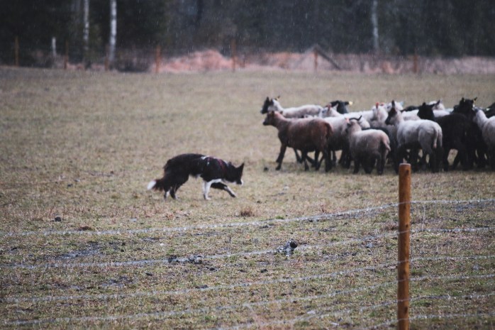 Likan kanssa tehtiin töitä liinassa. Ekalla kierroksella se alkuun halusi kovin vain räjäytellä ja tuntui koko kevään treeni haihtuneen sen mielestä, mutta lopulta se rauhoittui ja alkoi jo hakea kanssani suuntia ja kuunnella minua. Teimme poispäin ajoa. Toisella kierroksella Maiju meni sen kanssa lampaille ja minä jäin kauemmaksi. En tiedä oliko Likka vieraskorea vai mitä, mutta se kuunteli todella hyvin Maijua ja rauhoittui hyvin lampaiden taakse. Seuraavaksi Likalle pitäisi myös alkaa opettaa lampaiden kuljetusta ja hallintaa maltillisesti. Olin kuitenkin todella tyytyväinen siihen miten rauhakseen Likka Maijun kanssa oli. Kun saan sille lisää treenimetrejä lampaiden kanssa, paranee sen työskentely varmasti. Likka on kuitenkin nöyrä koira, joka kuuntelee hyvin. Lopuksi se tosin pääsi meiltä karkuun ja lampaat juoksivat vähän matkaa. Ihan viimeinen pätkä otettiin lyhyemmässä liinassa ja tehtiin hallittu nosto sen kanssa.