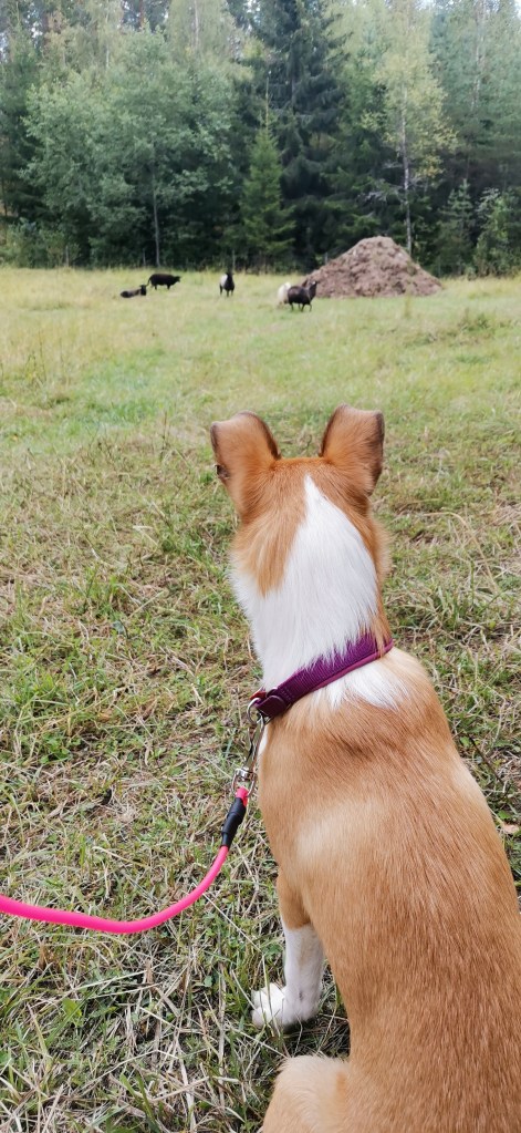 Lotta pääsi lampaille tänään ensimmäisen kerran. Aluksi se oli kiinnostunut vain kakasta, mutta kun päästin irti liinasta se selkeästi kiinnostui eläimistä ja rohkeasti juoksi niiden perässä! Aivan varmasti tästä saa työstettyä vaikka mitä! Olin hyvin iloinen, että Lotta kulki laitsalla niin reippaasti ja uteliaana!