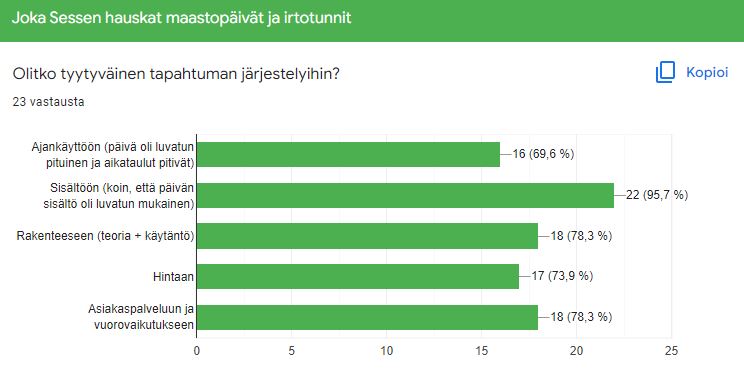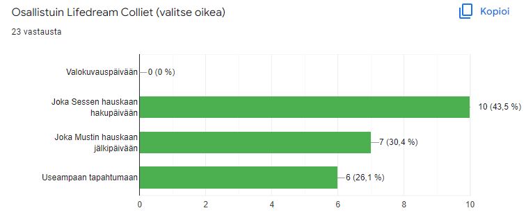 23 vastaajasta suurin osa oli osallistunut maastopäivään tai useampaan tapahtumaan. Vastauksissa kuitenkin selkeästi painottui maastopäivät, koska niitä olen pitänyt eniten. Tällä hetkellä Lifedream Joka Sessen maastopäivän (haku tai jälki) on suorittanut 51 koirakkoa. Palautekaavaketta keksin jakaa kuitenkin vasta viime syksyllä ensimmäisten kurssien jälkeen, joten kaikki osallistuneet eivät ole sitä saaneet.