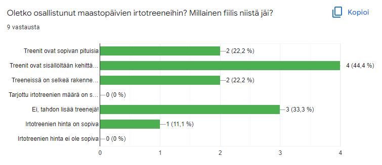 Onko sinulla esittää parannusehdotuksia irtotreenien yllämainittuun sisältöön, rakenteeseen tai johonkin muuhun? Mikä saisi sinut innostumaan ja osallistumaan? 9 vastausta