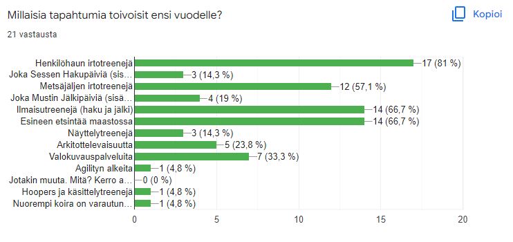 - Vastaan tähän, koska edelliseen ei saanut kuin yhden vaihtoehdon. Lisäksi tahtoisin enemmän irto hakutreenejä. Porukka on aina hauska ja tunnelma mukavan kevyt. Helppo olla