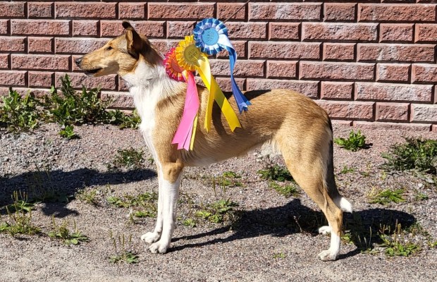 3 years old tricolour. Good size, Well presented. Feminene head needs more fill of muzzle and under jaw. Lenght of Neck ok. Topline ok. Rear angluations ok. Prefer better shoulder and lay back. On the move she’s clean behind, very loose behind. (vika lause on musta vähän outo)