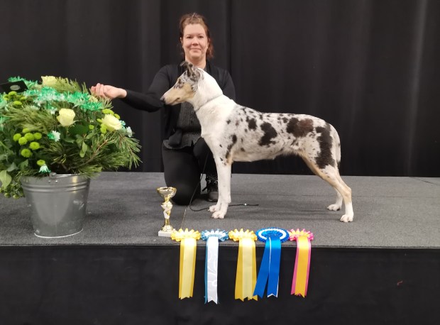 Tämä oli kyllä huikea aloitus Pimun viralliselle näyttelyuralle! Näyttelypaikalla se kulki rauhallisena ja uteliaana, ei välittänyt ihmisistä tai koirista, liukkaista lattioista. Tuomaria se Päivin kanssa hiukan jännitti, mutta kanssani isossa kehässä BIS junnu tittelistä kilpaillessa oli taas oma itsensä. Ei voi kuin ihailla sen lungia olemusta, vaikka päivästä venyi meille kaikille kohtuuttoman pitkä. Isossa kehässä tuomari nosti sen jatkoon kaikista rotunsa parhaista junnuista!!!! Valitettavasti emme kuitenkaan sijoittuneet.