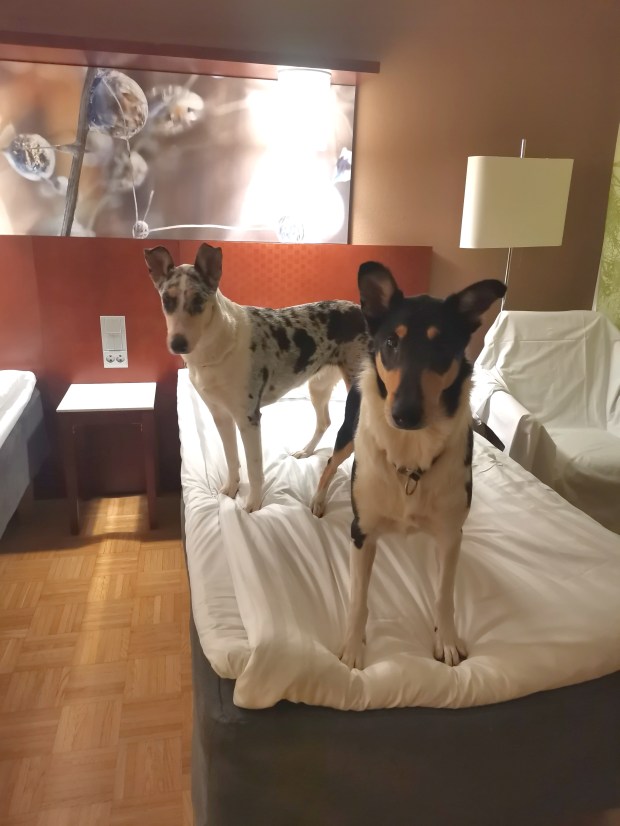 Hotellilla tytöt söivät hyvällä ruokahalulla ja pistelivät vielä possunkorvatkin jälkkäriksi sen aikana kun itse pääsin kauan kaipaamaani suihkuun. Kaaduin sänkyyn ja toivoin, että tytöt osaisivat nukkua vieraassa paikassa. Pimu olikin heti unessa, päivä oli ollut varsinkin sille erityisen raskas. Piiku käveli levottomana hetken aikaa ja kävi sitten viereiseen sänkyyn nukkumaan. Aluksi ne välillä haukkuivat käytävästä ja ulkoa kuuluvia ääniä, mutta lopulta väsy vei meistä kaikista voiton ja nukuttiin kellon soittoon, klo 5.30.