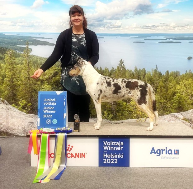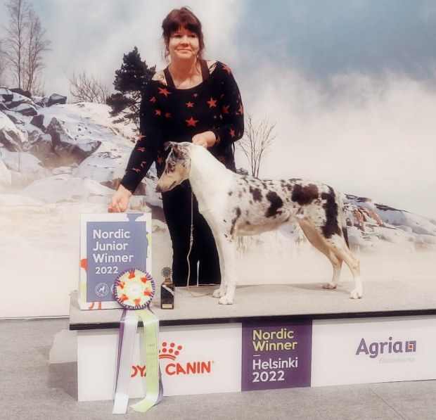 Pimu teki rotuhistoriaa valloittamalla Messukeskuksen kolme näyttelyä tyynellä ja itsevarmalla olemuksellaan, puhtaalla värillään ja rakenteellaan. Se voitti kolmessa päivässä itselleen neljä uutta titteliä ja sai sertit kasaan tulevaa muotovalion arvoa varten. Se on blue merleltä erittäin harvinainen temppu!