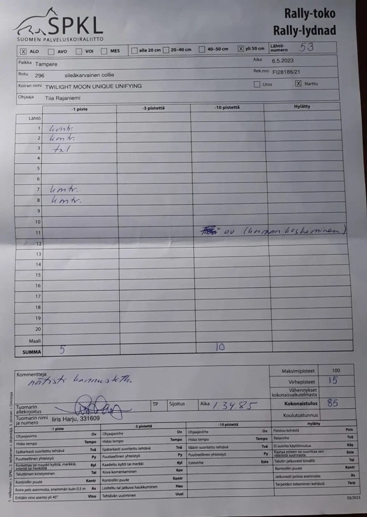 Lotta käväisi 6.5 rallytokokilpailuissa kasvattaja Tiian kanssa ja heillä meni super hienosti! Lopputulemana 85p ja hyväksytty tulos! Mieltä lämmitti miten innoissaan Tiia oli Lotan kanssa yhdessä tekemisestä. ❤️Lotta onkin oikea kultakimpale. Tästä se lähtee, tämäkin laji!