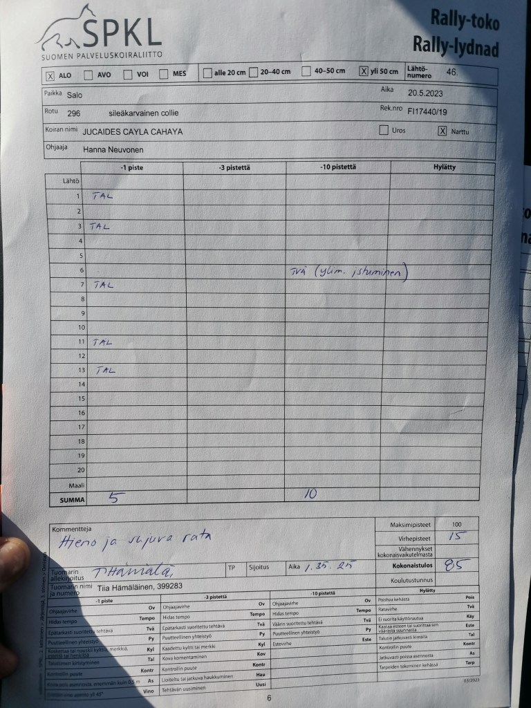 Tänään rally-tokokilpailuissa Salossa. Olin ilmoittanut kisoihin Piikun ja Likan, mutta koska Likka aloitti juoksun, sain mahdollisuuden ottaa Pimun mukaan sen sijasta. Minua jännitti jo aamusta. Ärsyttävää. En kyennyt syömään mitään. Paikan päällä menin ilmoittautumaan ja samalla tsekkasin alokasluokan radan. Se oli mielestäni aika haastava useilla käännöksillä ja juosten tehtävällä spiraalilla! Kylttejä taisi olla 13. Pimun mittaus meni hyvin, mutta huomasin kyllä, että se oli uudessa tilanteessa täysin ymmällään. Tuttu agsahalli, mutta ei agsaa!![]()