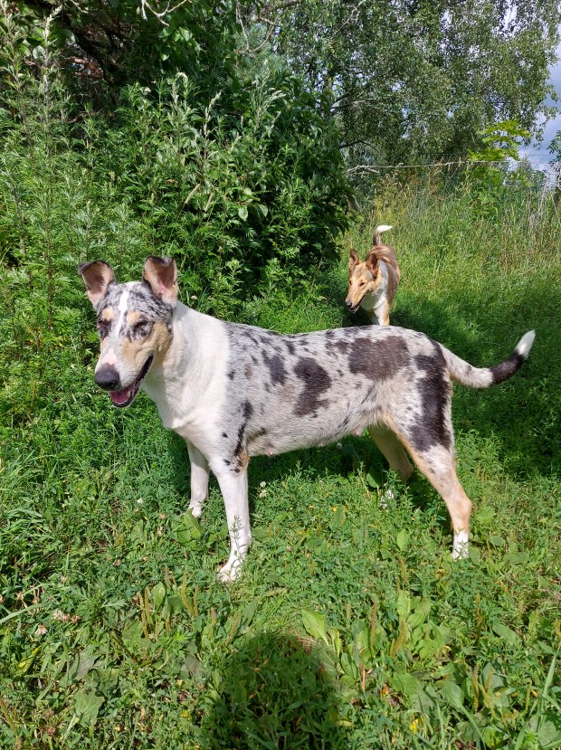 Pimu on alkanut pihalla hakeutua sivuun leikkivistä kavereista, varsinkin aisapari Lotan kanssa juokseminen ei ole enää niin mukavaa. Lotta ei tosin tätä ymmärrä ja hakee Pimua leikkimään vähän turhautuneenakin. Pimu myös katselee jo nyt vähän pihamaan kuoppia sillä silmällä, että niistä saisi sopivan pesän aikaiseksi 😀 Ruokaakin Pimu syö jo tupla-annoksen ja syökin kolme kertaa päivässä. Possu kun on, on ruokahalu ollut hyvä ihan alusta lähtien. Penturuokaan siirtyminen on aiheuttanut Pimulle hieman löysän vatsan, mutta pikku hiljaa lisään määrää. Pimu saa ruuan mukana myös vaihdellen pieniä määriä erilaisia raakalihoja kuten poroa, lammasta kalkkunaa, lohta, possua ja kanaa. Pimu on voinut koko tiineyden ajan hyvin, ei ole oksennellut ja on muutenkin reipas. Tiineys on tehnyt siitä erittäin hellyydenkipeän ja se viettääkin kainalossani mielellään aikaansa.