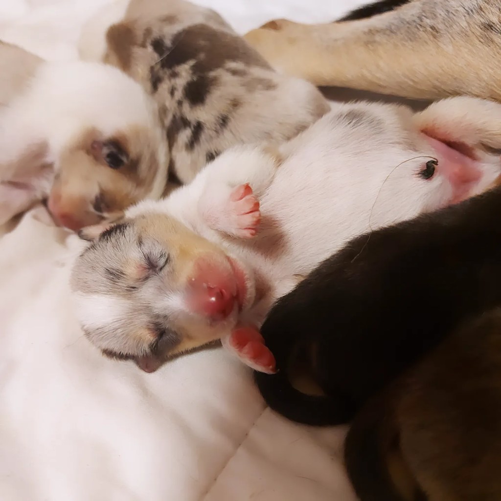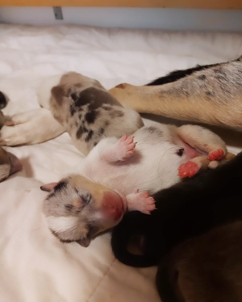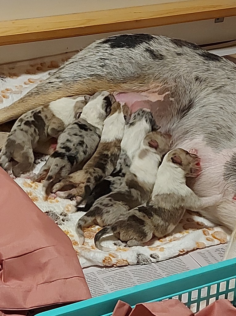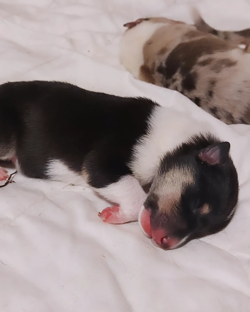 Pennut syntyivät useimmiten pää edellä ja osa sikiöpussi valmiiksi rikki, mutta osa tuli perä edellä. Toinen merle uroksista syntyi täysin ilman pussia liukkaasti kuin ohjus. Kuitenkaan kukaan pennuista ei krohissut ja vaikka syntymän jälkeen kesti hetken saada ne havahtumaan tähän maailmaan, olivat nopeasti pirteitä ja eläväisiä. Yritin laittaa pentuja mahdollisuuksien mukaan heti tissille, mutta rivakkaan synnytyksen myötä se oli hankalaa. Pimu synnytti suurimman osan pennuista seisten.