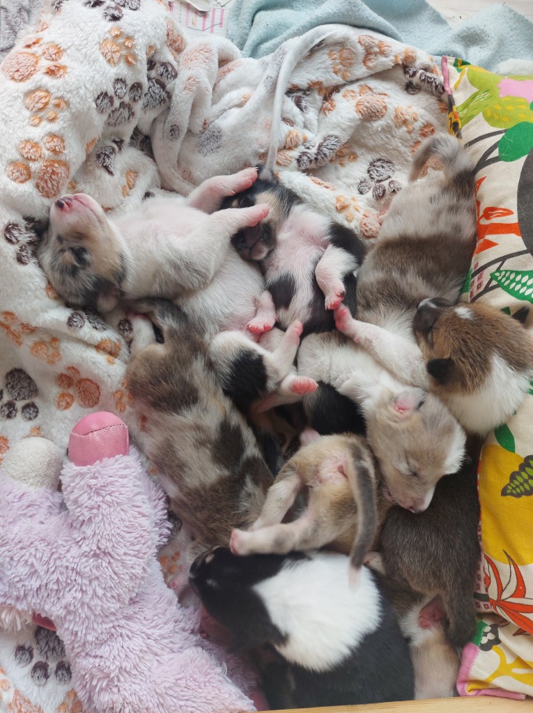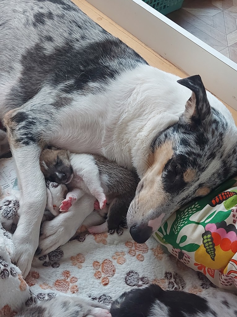 Muuten täällä sujuu hyvin. Kiirettä on pitänyt kun meillä on vieraillut Sirja muutaman päivän ja Riia kävi eilen auttelemassa. Myös ystäväni Virva kävi lauantaina juhlimassa pentujen viikko-synttäriä. Tällä viikolla on tarkoitus käydä jo lenkkeilemässä isojen kanssa ja jättää Pimu pentujen kanssa keskenään. Nyt pennut ovat jo niin isoja, että on epätodennäköistä, että se makaisi niitä. Kaikkea muuta voi kuitenkin sattua ja tapahtua joten nukun edelleen olkkarissa ja vietän laatikon äärelllä luonnollisesti suurimman osan ajastani seuraten pentujen kehitystä ja ääntelyä. Huoli pienistä on suuri. Kokemus on opettanut, että pentuihin voi tulla milloin tahansa mitä tahansa ja toivon niin paljon, ettei näiden kanssa tulisi mitään takapakkia!!🙏🩷