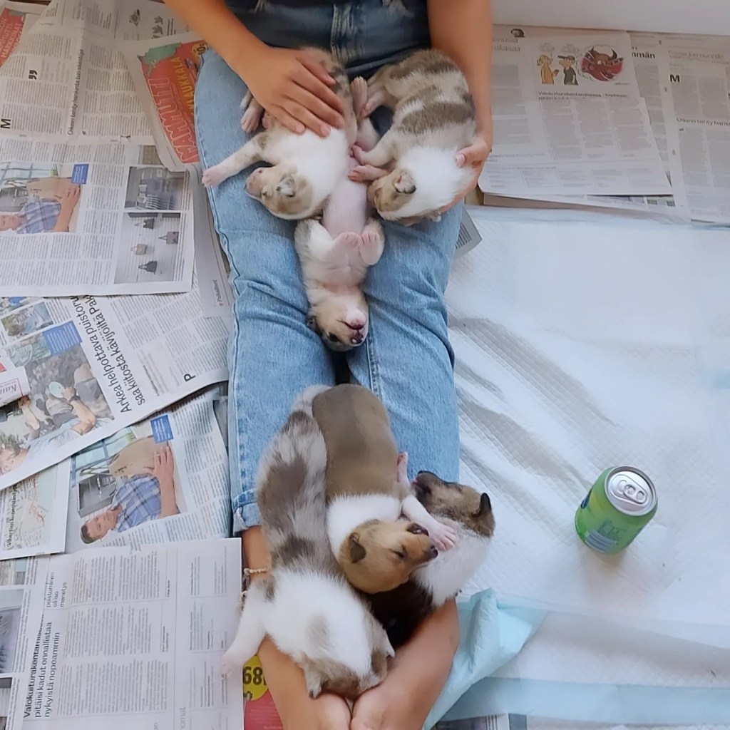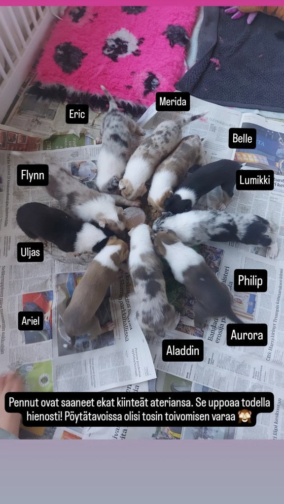 Kaiken kaikkiaan olen valtavan tyytyväinen näihin pentuihin ja niiden kehitykseen. Pennut ovat avoimia, mönkivät syliin ja luovat jo nyt vahvasti katsekontatkia ihmiseen, kuuntelevat ääntä. Kaikki viihtyvät hyvin sylissä ja rauhoittuat siihen. Temperamenttieroja alkaa pennuissa näkyä: osa on hyvinkin tyytyväisiä jos saavat vain ruokaa nenän eteen, toiset ääntelevät enemmän. Suurin osa viettää aikaansa tutkien enemmän ympäristöään. Kaikki nukkuvat välillä kasoissa ja toiset myös rennosti itsekseen, Ne viettävät laatikossa 99% ajastaan ja osaavat jo hakeutua sanomalehdelle tarpeilleen. Kiinteän ruuan myötä joillakin on ollut hieman löysä vatsa, mutta mitään ripulia ei ole ilmennyt missään vaiheessa. Kasvattajakollegan ehdotuksesta olen pohtinut lisääväni laatikkon ”vessapuolelle” sahanpurua kunhan pennut kasvavat vielä viikon tai kaksi. Se kuulemma sitoo hyvin jätökset, on helppo hävittää ja sitoo myös hajuja hyvin. Kymmenen pennun kanssa tämä on ehdottomasti kokeilemisen arvoinen idea!