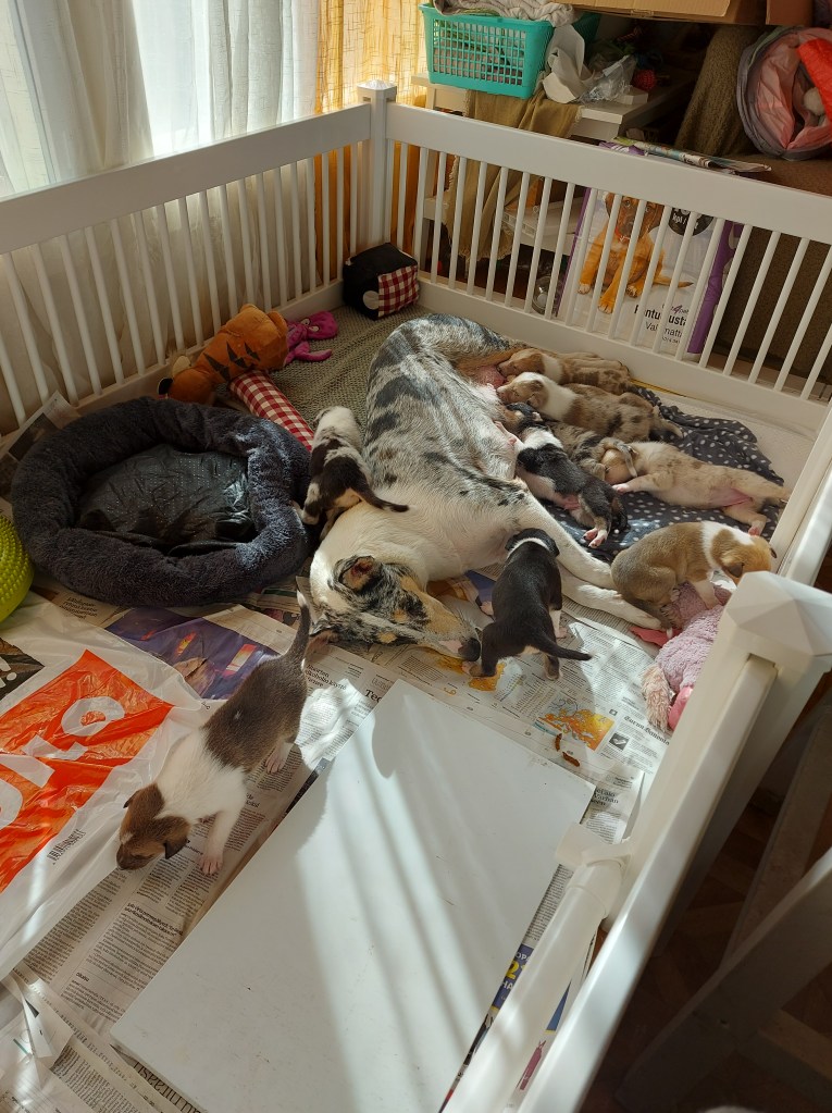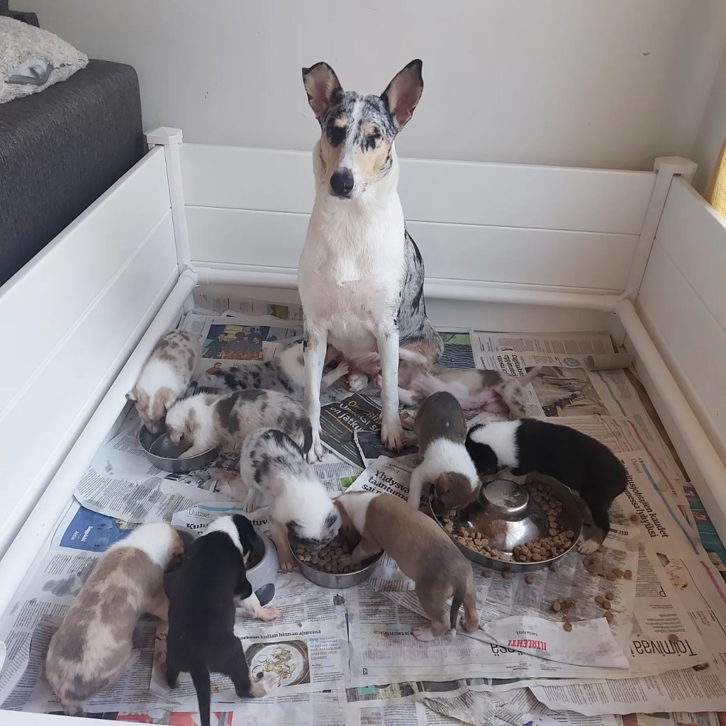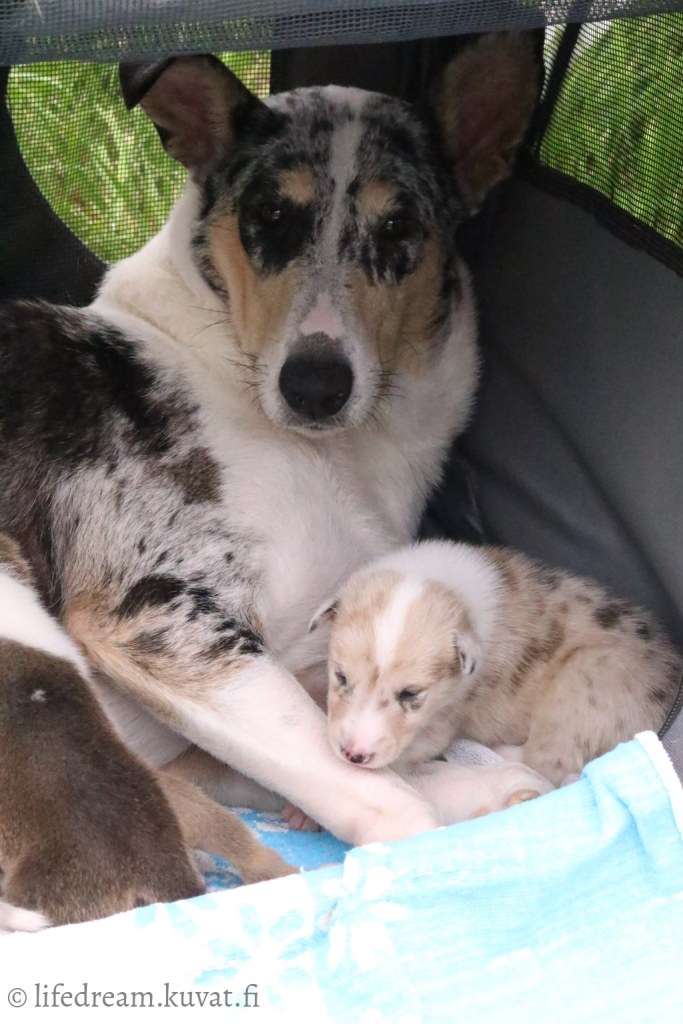 Aikaisemmin minulla ei ole ollut mahdollisuutta pitää aivan näin pitkää lomaa, vaan olen kiitollisena saanut kotiin auttavia käsiä ensimmäisten viikkojen aikana. Yleensä ystävistäni on aina joku ollut elämäntilanteessa, että on voinut viettää meillä jopa viikkoja. Toivon, että pystyn jatkossakin pitämään tällaisen loman, sillä pentujen kasvun alkuajat ovat tärkeää aikaa ja varsinkin jos ongelmia ilmenee. Näiden pentujen kohdalla ongelmia ei ole onneksi ollut. Kaikki kymmenen ovat alusta saakka olleet elinvoimaisia.