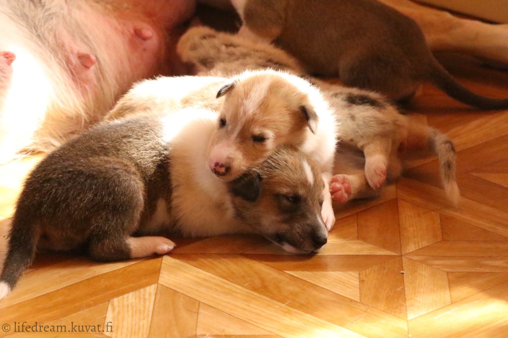 Tästä eteenpäin meillä käy myös pennunkyselijöitä. Koska pentuja on näin paljon, on vierailevien ihmisten määrä omasta takaa jo ihan tarpeeksi, enkä ota kylään ihmisiä, jotka muuten vain haluavat tulla palluttelemaan pentuja. Ihmiset eivät tunnu ymmärtävän, että vieraiden vastaanottaminen omaan kotiin on työlästä ja aikaa vievää puuhaa. Pennut saavat kyllä tarpeeksi käsittelyä jo varsinaisten pentukyselijöiden ja ystävieni toimesta. Toisaalta, koska asun yksin, olen aina ollut huolissani kasvateistani, että ne saisivat tarpeeksi käsittelyä erilaisilta ihmisiltä. Meillä kun arki on melko rauhallista ja hiljaista jos vertaa vaikkapa lapsiperheen aktiiviseen elämään!