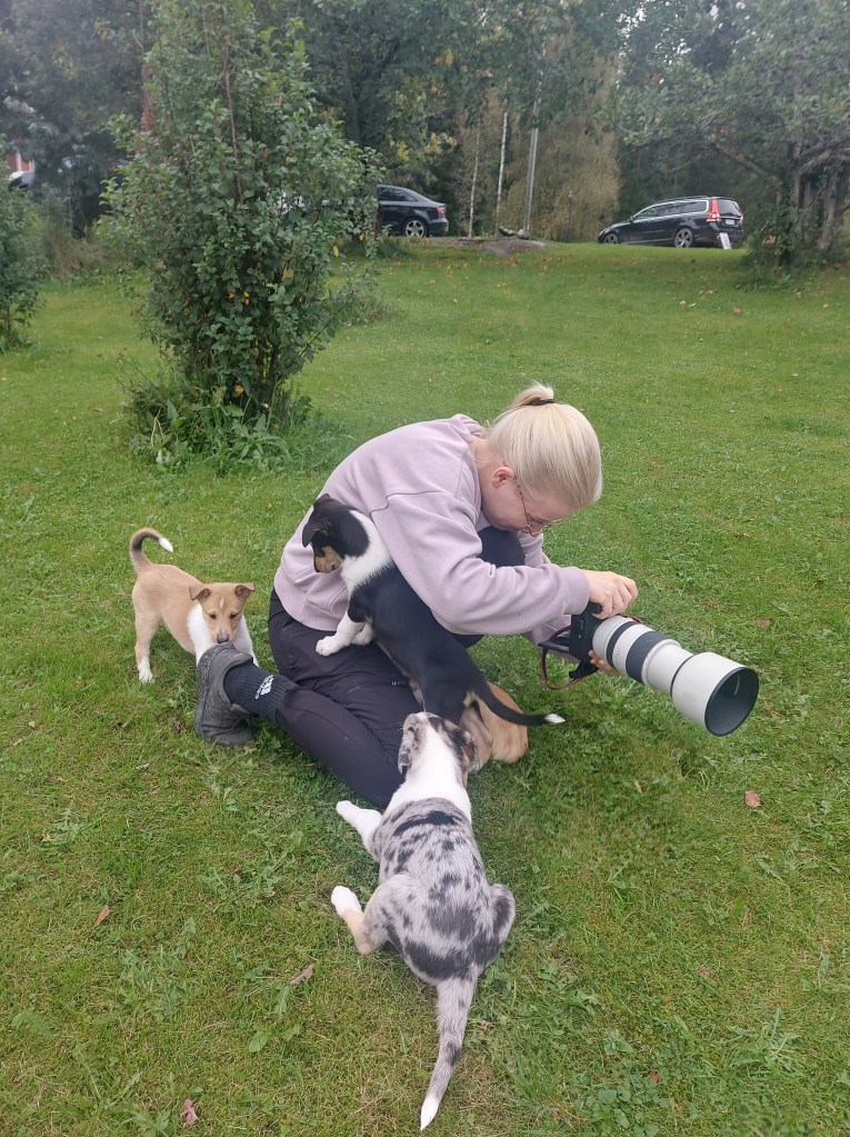 Meillä kävi paljon vieraita myös loppuaikana ja valokuviakin sain pennuista paljon. Niihin on ihan palata myöhemmin! Loppujen lopuksi pentuaika on niin nopeasti ohi! Pentujen fyysinen kehitys oli huikeaa: ne juoksentelivat ja hyppivät etupihan kalliolla ja portaissa, tutustuivat pimeään agilityputkeen ja seurasivat minua metsässä sekä omalla pihalla sateessa ja kylmässä, pitkässä nurmikossa. Illat olivat niin pimeitä, että pennut liikkuivat usein pimeässä ja taskulampun valossa. Kävimme porukalla ilta-ja aamupissalla takapihan metsikössä ja sinne ne lähtivät myös itsenäisesti heti kun silmä vältti, joten pentue otti koko pihan hyvin haltuun. Minulta kysyttiin mitä käsittelyohjelmaa noudatan pentujen kanssa, mutta minulla ei sellaista ole koskaan ollut. Kaikki ideani, tai ainakin suurin osa, on lähtöisin luennoilta, joilla olen istunut. Opaskoirakoulun käsittelyohjelmasta olen noukkinut joitakin palasia ja biosensor ohjelmasta muita. Lisäsin joukkoon asioita, joita tiesin harrastuskoirille olevan tärkeitä sekä niitä, joita koin pentujen joutuvan kohtaamaan myöhemmin elämässä.