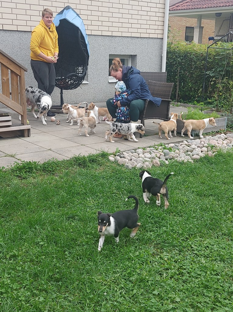 Onneksi Merida eli Kippo muutti sijoitukseen Riian ja Elinan luokse Turkuun ja kotiin jäi tricolour narttu Lunttu. Yhteisomistukseen Pimun kasvattajan Päivin kanssa jäi soopelinarttu Irma. Uroksistakin suurin osa meni ennestään tutuille ihmisille ja kaikki ovat somettaneet tai viestitellet ahkerasti. Some on kyllä huikea juttu! Ennen aikoina pennut haettiin ja ne hävisivät elämästä eri tavalla. Nyt niitä pääsee somessa seuraamaan ja whatsapp viesteissä on helppo lähettää kuvia ja videoita. Tämä on minulle kasvattajana erityisen tärkeää ja on ollut hienoa huomata, että se ihan oikeasti auttaa luopumisessa!