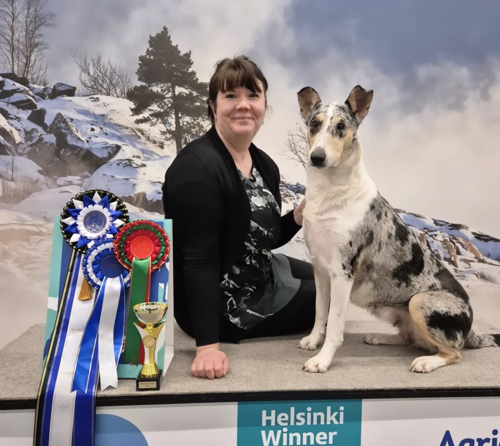 Mature blue merle. Lovely proportions. Excellent wedge shaped head with slight stop. Excellent reach of neck, excellent ear shape and carriage. Excellent front angled deep chest firm condition. Excellent rear angulation. A touch short in croup. Good color of marking. Excellent movement in all directions. AVO ERI 1 SA SERT -> FI MVA