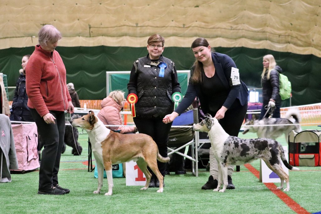 Kaunislinjainen hyvin tasapainoisesti rakentunut aikuinen narttu. Oikeat pään linjat. Kauniit korvat. Riittävän merkitty otsapenger. Hyvä kuono-osa ja purenta. Kaunis kaulan kaari. Tilava pitkä rintakehä. Hieman pitkä lanne. Tasapainoiset kulmaukset ja liikkuu sujuvasti. Kirkas sininen väri. Marmorointi ok.