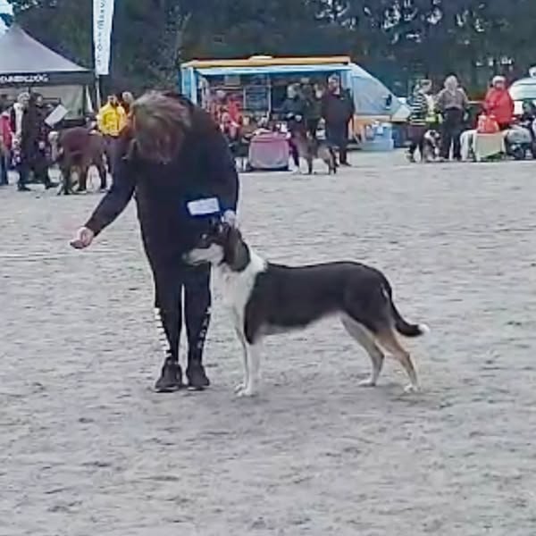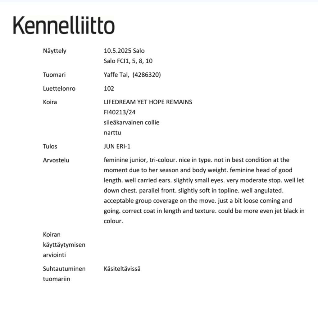 Näyttelyuutisia! Luntun harrastusputki jatkui tänään kun se pääsi ekaa kertaa viralliseen näyttelykehään Saloon! Vähän jännitin mitä mieltä se on koiramäärästä, mutta se oli turhaa. Ihmiset, koirat ja muut se ohitti hienosti ja odotti vuoroaan uteliaan rauhallisena. Odotin, että saadaan EH (erittäin hyvä) ja toivoin ERIä (erinomainen). Niinpä tavoitteet täyttyi hienosti kun saatiin eri ja luokkavoitto. Tuomari Tal Yaffe tuli sanomaan, että Lunttu on oikein kaunis tyttö, mutta hieman lihava (apua!?) Eikä tästä ja juoksusta johtuen parhaimmillaan. Tästä syystä SA jäi saamatta. Olen kuitenkin huipputyytyväinen tähän ja motivoitunut lähtemään uudelleen Lumpion kanssa kehiin!