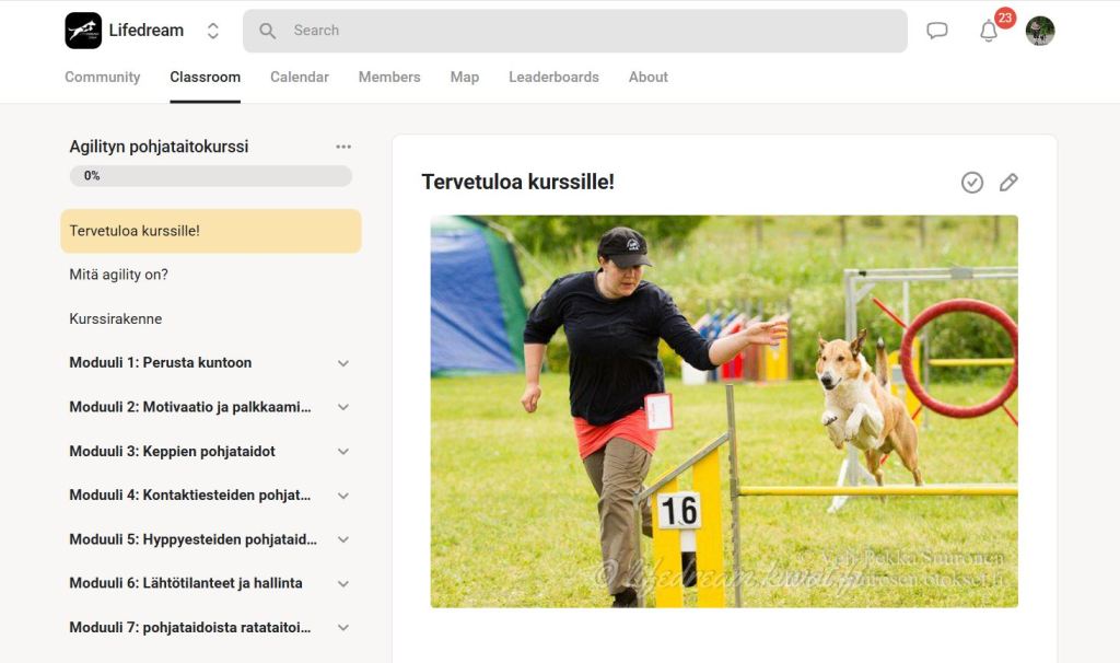 Tavoitteena agility? Tämä verkkokurssi sopii kaikille agilityn pariin hurahtaneille tai siitä haaveileville. Rakenna koirallesi itsevarmuus, kehonhallinta ja yhteistyö ennen agilityesteitä. Tällä verkkokurssilla rakennat koirallesi vahvat ja kestävät pohjataidot agilityyn ilman kiirettä, painetta tai suoritusvaatimuksia. Kurssi etenee loogisesti, koiran hyvinvointi edellä, ja antaa koirakolle valmiudet siirtyä agilityn alkeisiin tai jatkokurssille.