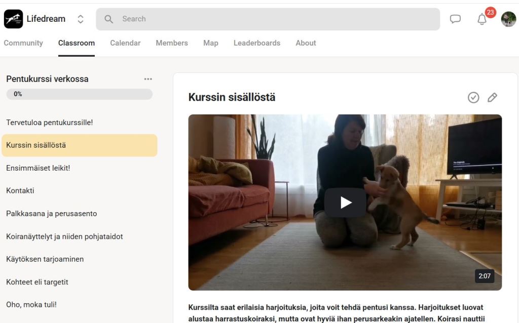 Tavoitteena koiraharrastus? Opeta koirallesi vahva alku lajiharrastamiseen turvallisesti ja koiralähtöisesti. Tällä verkkokurssilla rakennat pennullesi erilaisia pohjataitoja ilman kiirettä, painetta tai suoritusvaatimuksia. Kurssi etenee loogisesti koiran hyvinvointi edellä ja sisältää myös paljon erilaisia esimerkkivideoita.