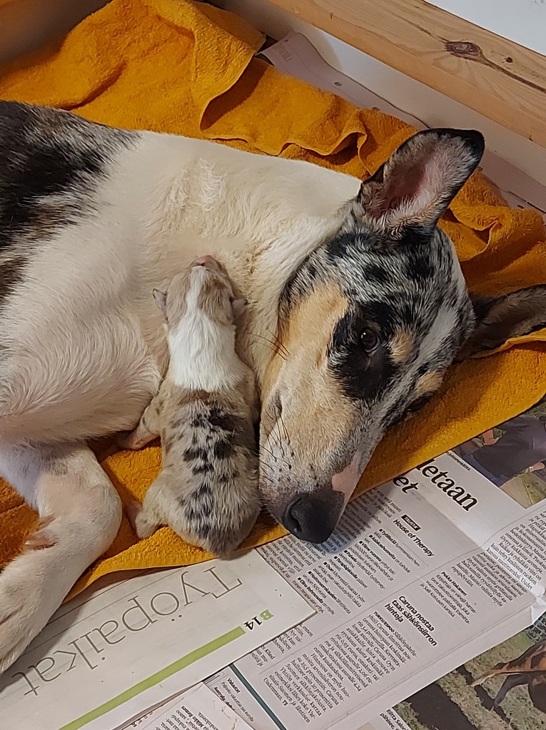 Kippo jäi sijoitukseen Pimun ekasta pentueesta. Se oli kymmenen pentueen viimeisenä syntynyt pentu ja samantien sykähdytti minua. Vaikka se oli väriltään vielä epävirallinen soopelimerle, pohdin ensimmäiset kolme viikkoa tosissani pitäväni sen kotona. Siinä oli samanlaista ”se on siinä” fiilistä kuin äidissään Pimussa, joka vain ui sydämeeni vaikkei koko pentua pitänyt olla siinä kohtaa ottamassa. Onnekseni ystäväni Riia oli ottamassa minulta sijoituskoiraa ja yhdessä pohdittiin heidän perheeseen sopivaa pentua ja melko pitkään vatvoimme valintoja.