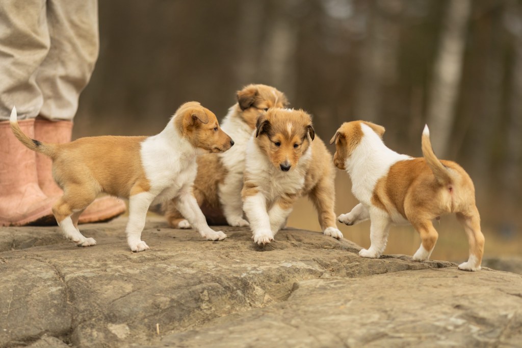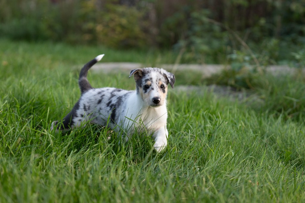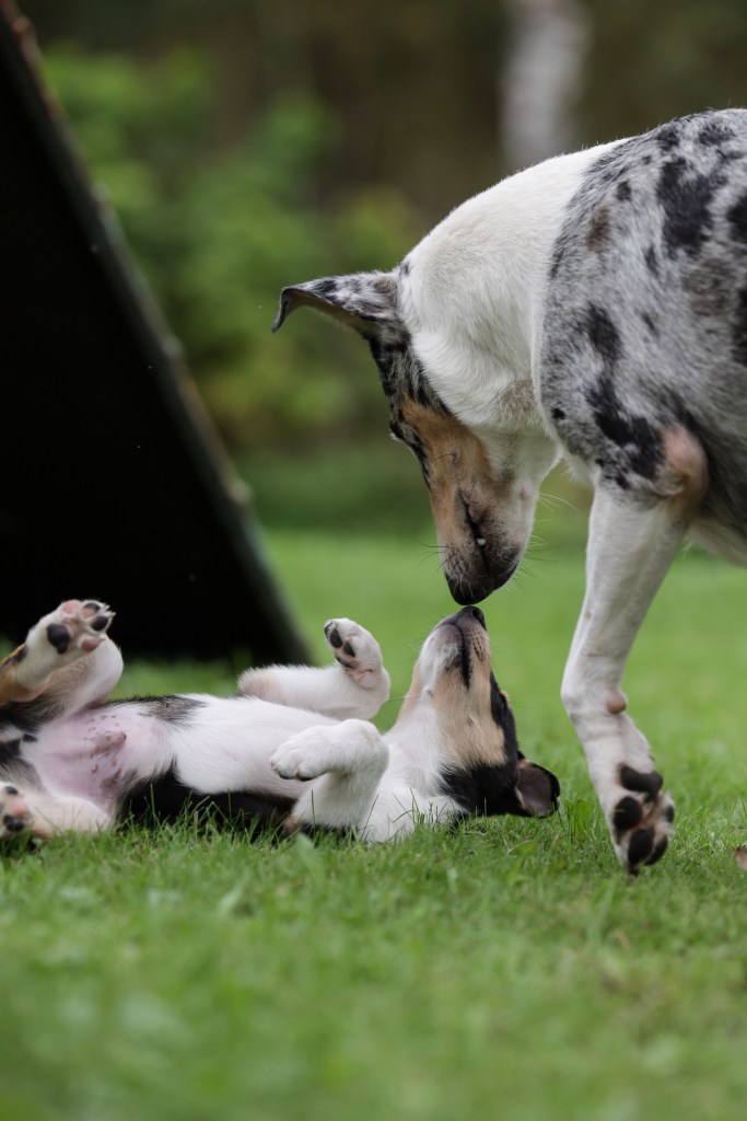 Ne tutustuvat myös agilityn pentupuomiin ja heiluviin, jyrkkiin, liukkaisiin ja rapiseviin alustoihin. Haastan pentuja myös viemällä niitä yksitellen niille vieraisiin tiloihin, tutustumme kanalaan, pimeisiin tiloihin ja totutan ne ylitettäviin esteisiin sekä erilaisiin pintamateriaaleihin. Yleensä tässä kohtaa käytän pennut useamman kerran autolla metsässä, kaupan pihalla, treenihallilla, juna-asemalla tai ystävieni luona. Mahdollisuuksien mukaan tutustumme lampaisiin ja hevosiin. Toki tottuneesti ja rauhallisesti käyttäytyvä emo tulee joka paikkaan mukaan. Pennut saavat kohdata uusia ja jännittäviä asioita omassa tahdissaan ja näissä tilanteissa opin niistä paljon myös itse. Pennuissa ja pentueissa on eroja. Leikin pentujen kanssa paljon ja aloitan myös peruskoulutuksen pohjataidot tutustuttamalla pennut palkkasanaan ja esim istumiseen. Myös kaulapantaan ja remmiin tutustutaan. Pientenkin pentujen kynsiä tulee leikata ja totuttaa ne muihinkin hoitotoimenpiteisiin.