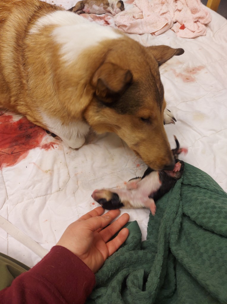 Collien keskimääräinen tiineyden kesto on 62,4 vuorokautta. Synnytyksen lähestyessä narttu rauhoittuu ja alkaa hakeutua syrjäisiin paikkoihin kuopimaan ja rakentamaan pesää. Tästä syystä pentulaatikon laitan pystyyn noin viikkoa ennen laskettua aikaa ja narttu saa tutustua siihen rauhassa. Kun nartun avautumisvaihe alkaa, siitä tulee levoton ja se yleensä alkaa vaeltaa. Kasvattajan rooli koiran synnytyksessä on olla aktiivinen tarkkailija. Synnytyksessä seuraan tilannetta yleensä samassa huoneessa ja tarjoan emolle myös turvaa jos se sitä kaipaa. Yleensä nartut hoitavat homman itse kun varsinainen työntövaihe alkaa ja pennun synnyttyä hoitavat innostuneena pentujaan. Itselläni on ollut tapana katsoa, että narttu katkaisee napanuoran ja synnyttää jälkeiset normaalisti. Saatan myös kuivata pentua puhtaalla pyyhkeellä.