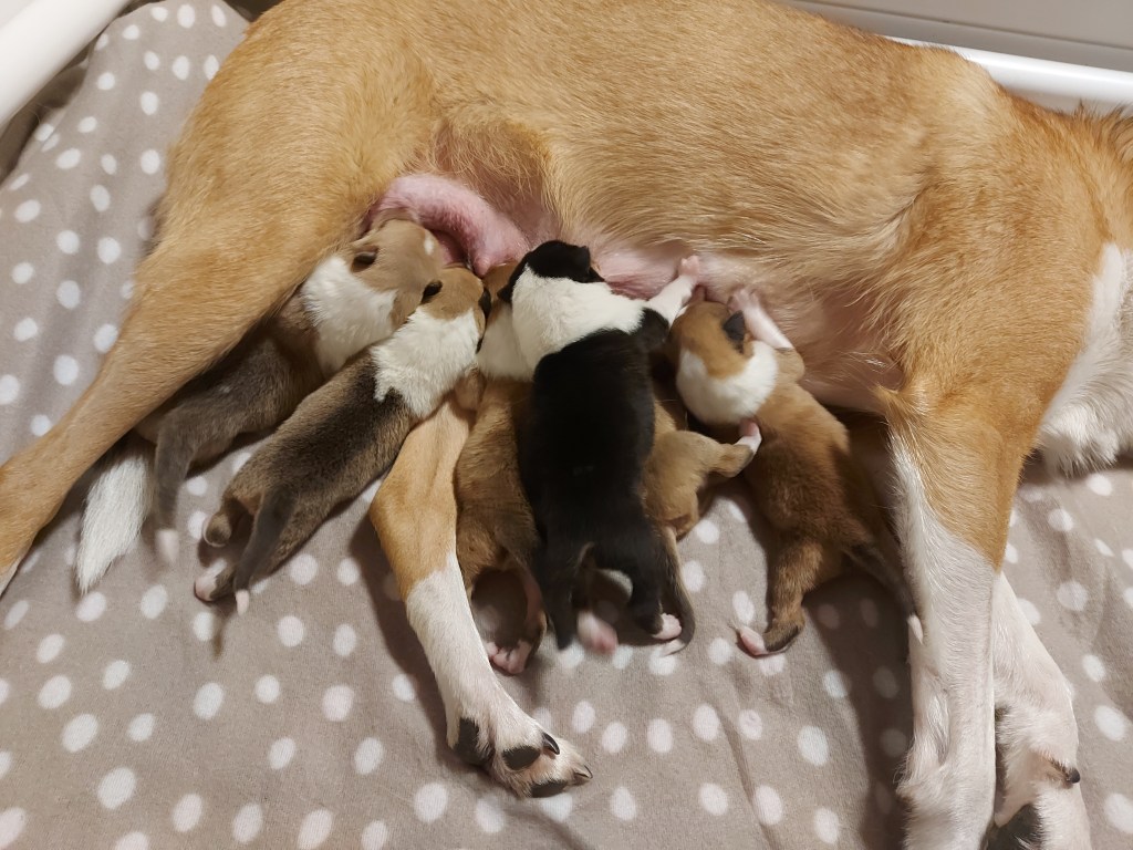 Synnyttäneen nartun ja sen pentujen tulee olla ensimmäiset viikot rauhassa muilta koirilta ja turhalta trafiikilta. Tästä syystä en ota meille vieraita pennunkatsojia kuin vasta pentujen ollessa yli kolmiviikkoisia. Toki meillä käy silloin tällöin sukulaisia tai ystäviäni käsittelemässä pentuja, mutta suurimmaksi osaksi narttu saa keskittyä pentuihinsa. Synnytyksen, emon käytöksen ja pienten pentujen kasvun kirjaan aina ylös, jotta osaan vertailla ja analysoida niitä myöhemmin. Nartut ovat erilaisia. Toiset hyväksyvät nopeasti vieraatkin ihmiset laatikon laidalle kun taas toiset selkeästi suojelevat pentujaan enemmän. Aivan pienet pennut vain nukkuvat ja syövät, joten niissä ei ole paljon nähtävää. Ne eivät ota kontaktia ihmiseen, mutta löytävät hämmästyttävän tarkasti maitobaarin.