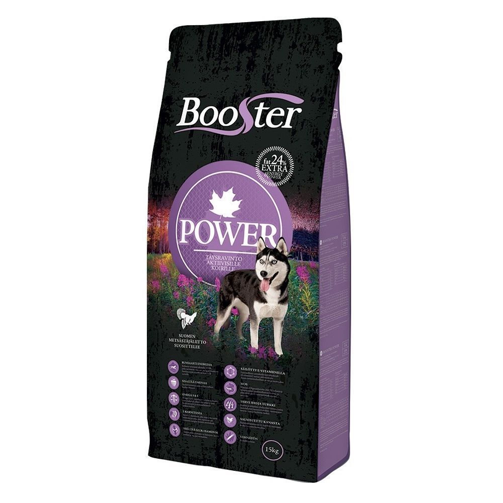 BOOSTER POWER on aktiivisen koiran ruoka, joka sisältää kaikki aikuisen koiran tarvitsemat ravintoaineet hyvään terveyteen ja elinvoimaan. Lihaisa (lihapitoisuus 45%) Booster Power on erinomainen metsästyskauden ruoka paljon energiaa tarvitsevalle metsästyskoiralle. Runsaan rasvakoostumuksensa ansiosta Booster Power on myös mainio ruoka harrastuskoiralle erityisesti kilpailu- ja intensiivisellä harjoittelukaudella. Booster Power on myös ihanteellinen työkoiran ruoka ja tukee mm. valjakkokoiria ja virkakoiria vaativissa ja tärkeissä tehtävissään.