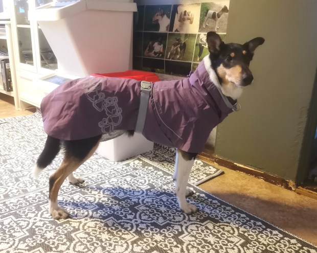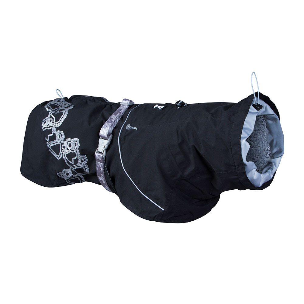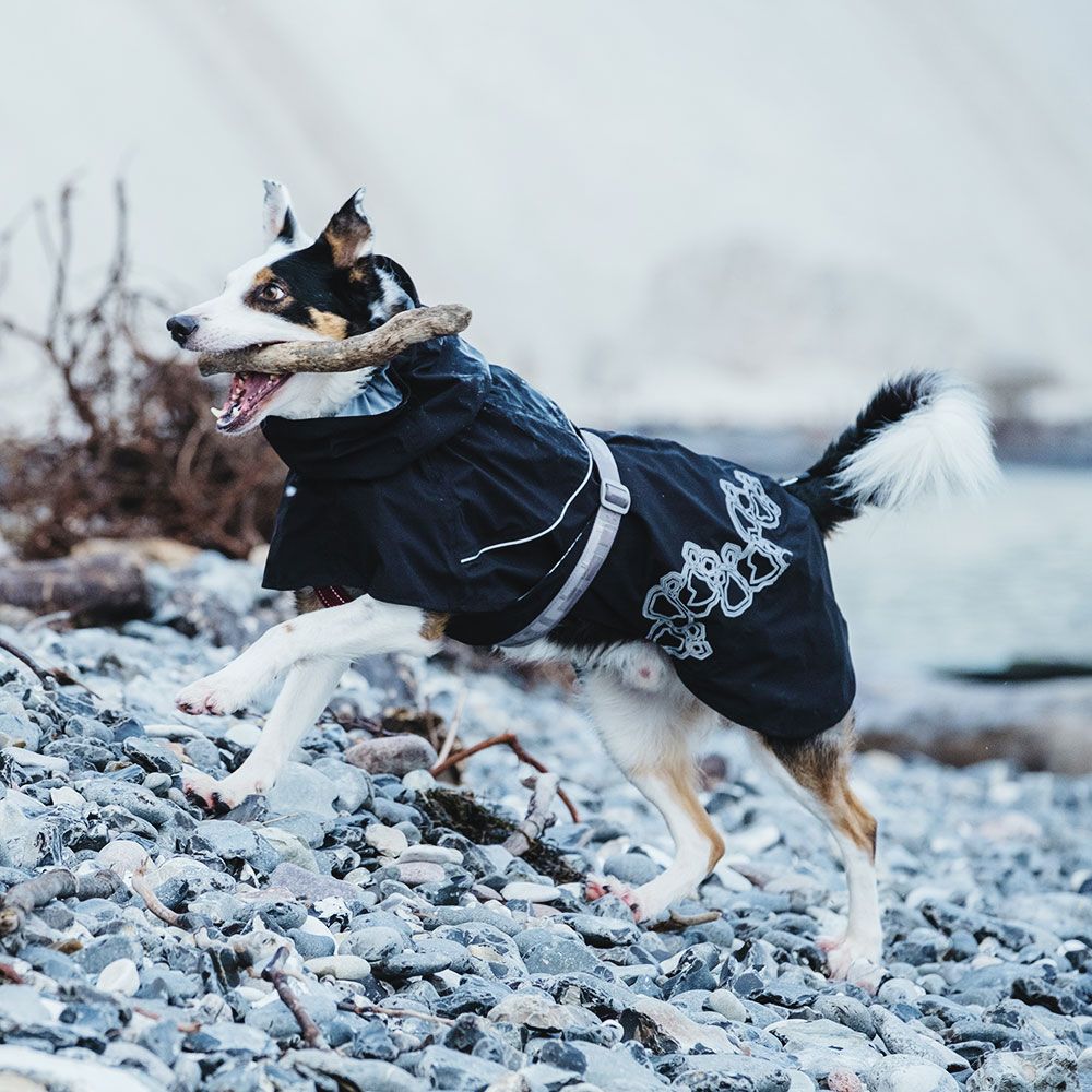 Hurtta Drizzle Sadetakki, Korppi. Meidän tyttöjen ehdoton valinta sadekelien remmilenkeille ja miksei myös treeneihin. Hengittävä takki tarjoaa suojan sadetta, tuulta ja kuraa vastaan. Sisäpuolen lämmittävä foliokuvioitu vuori heijastaa koiran omaa ruumiinlämpöä takaisinpäin, mikä vilkastuttaa verenkiertoa ja takki pitääkin kostean kelin koleuden tehokkaasti poissa luista ja ytimistä. Kaulus voidaan vetää hupun tavoin korvien suojaksi.